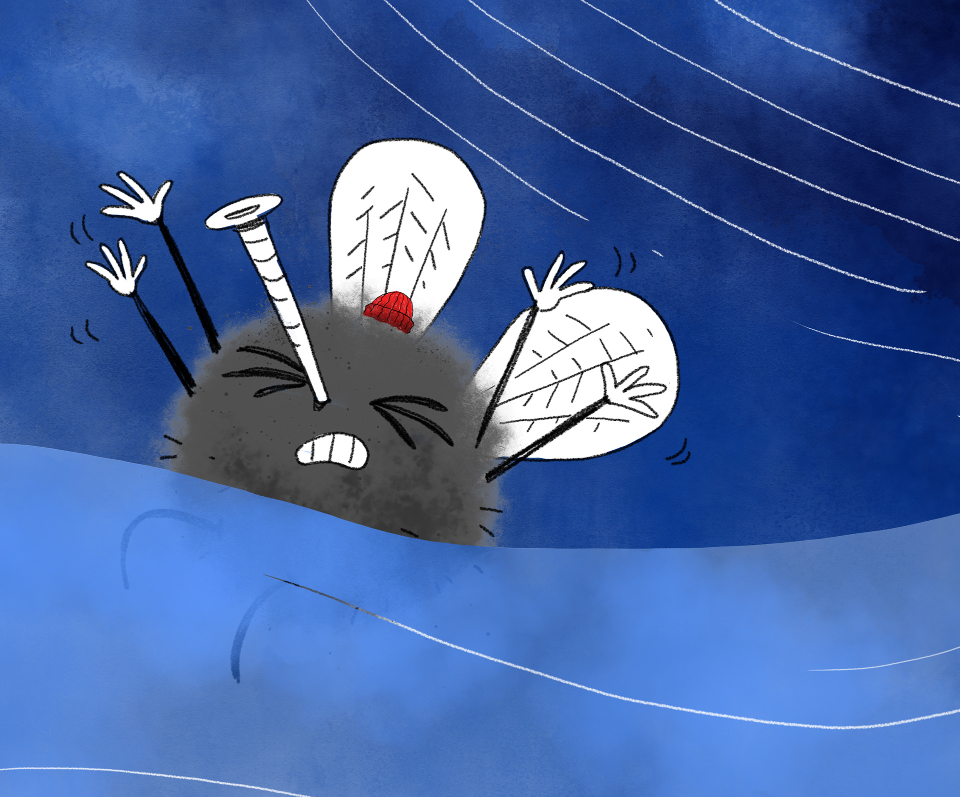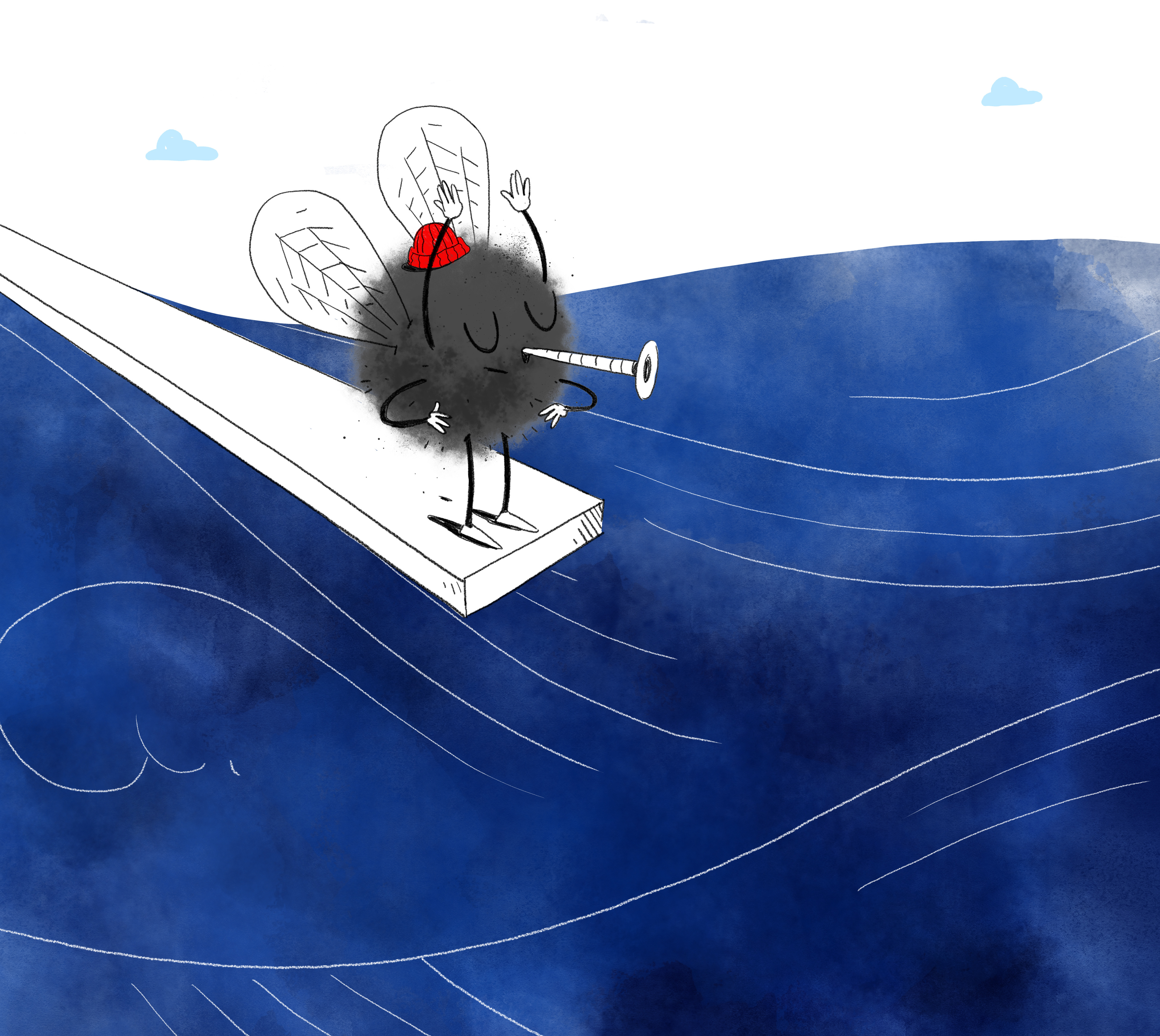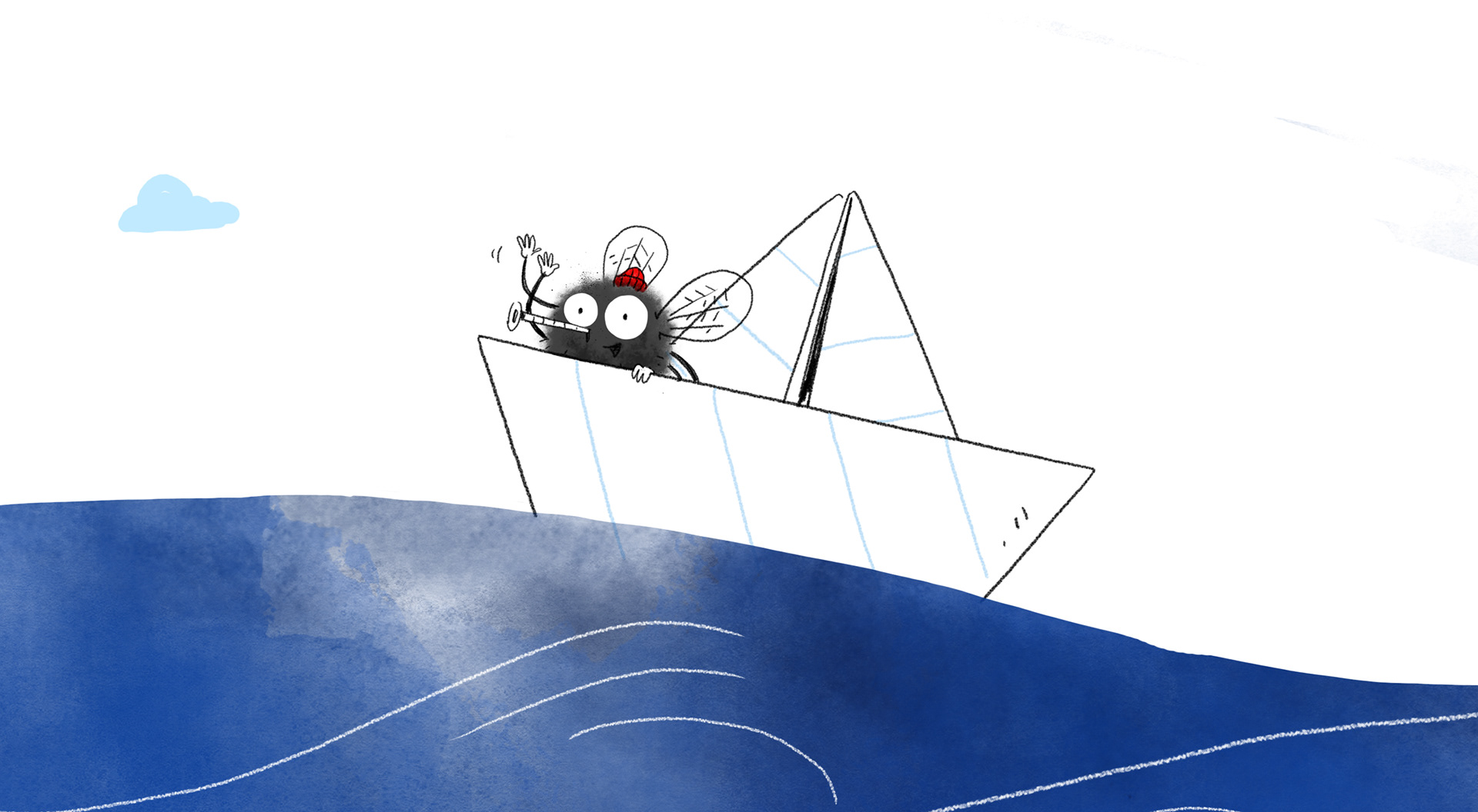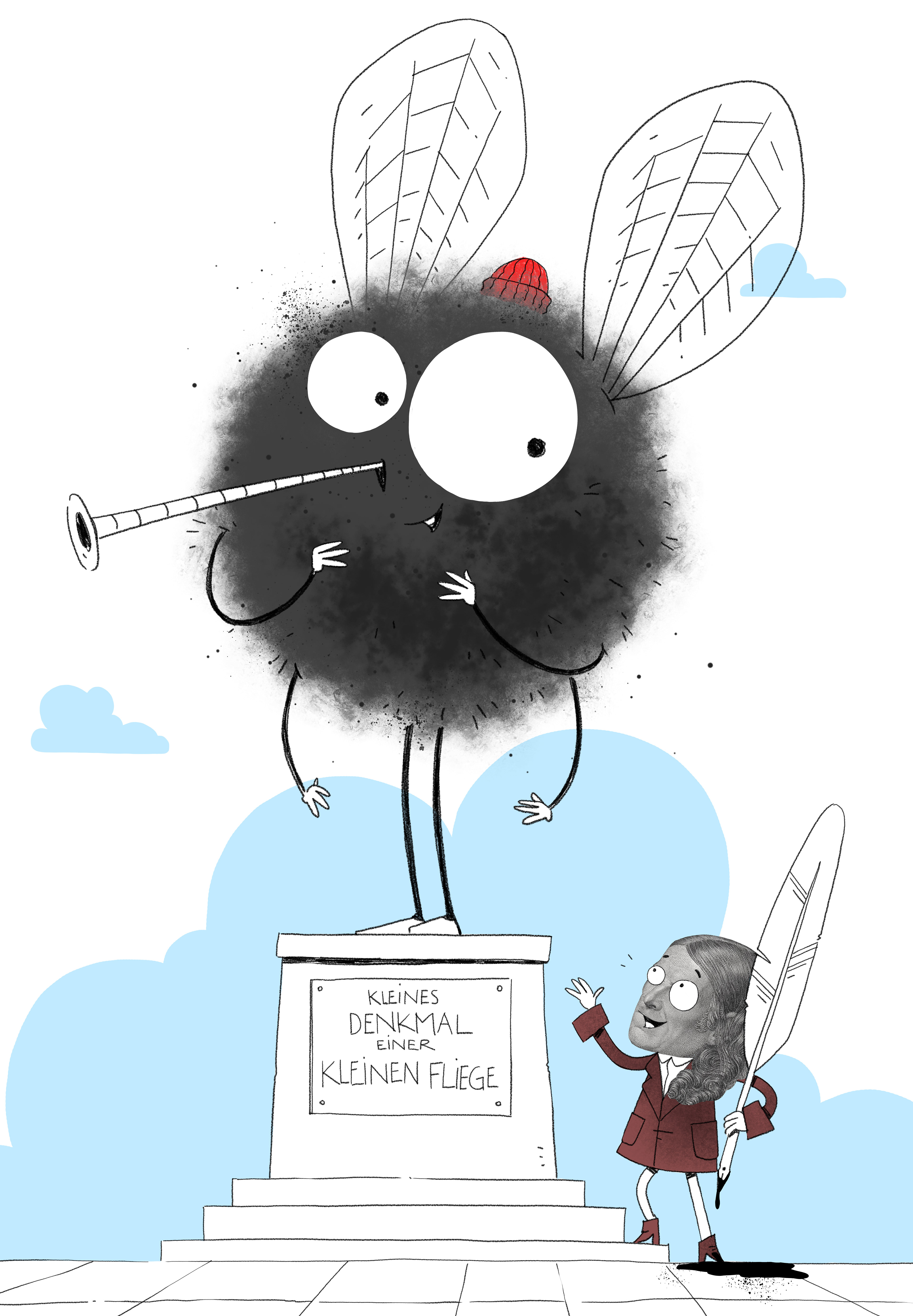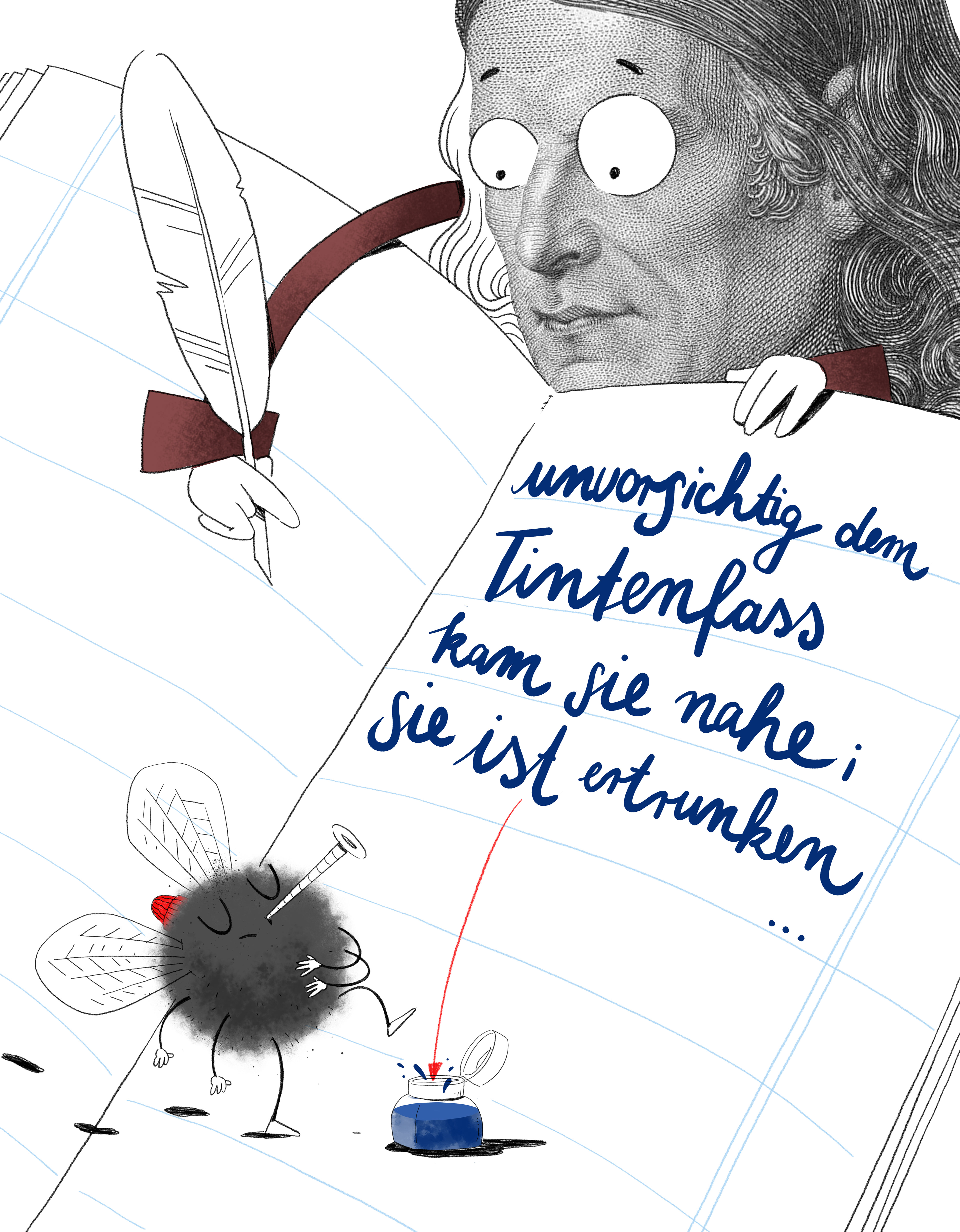 Die folgenden Illustrationen entstanden bei der Entwicklung eines illustratorischen Konzepts, um Kindern den Dichter Friedrich Rückert (*1788 in Schweinfurt; † in Neuses) nahezubringen. Die Bildidee basiert auf Rückerts Gedicht "Kleines Denkmal einer kleinen Fliege", in dem die "kleine Fliege" im Tintenfass des Dichters ertrinkt. Die Fliege soll darüberhinaus als Identifikationsfigur zur Wissensvermittlung rund um die historische Figur Rückert eingesetzt werden.
