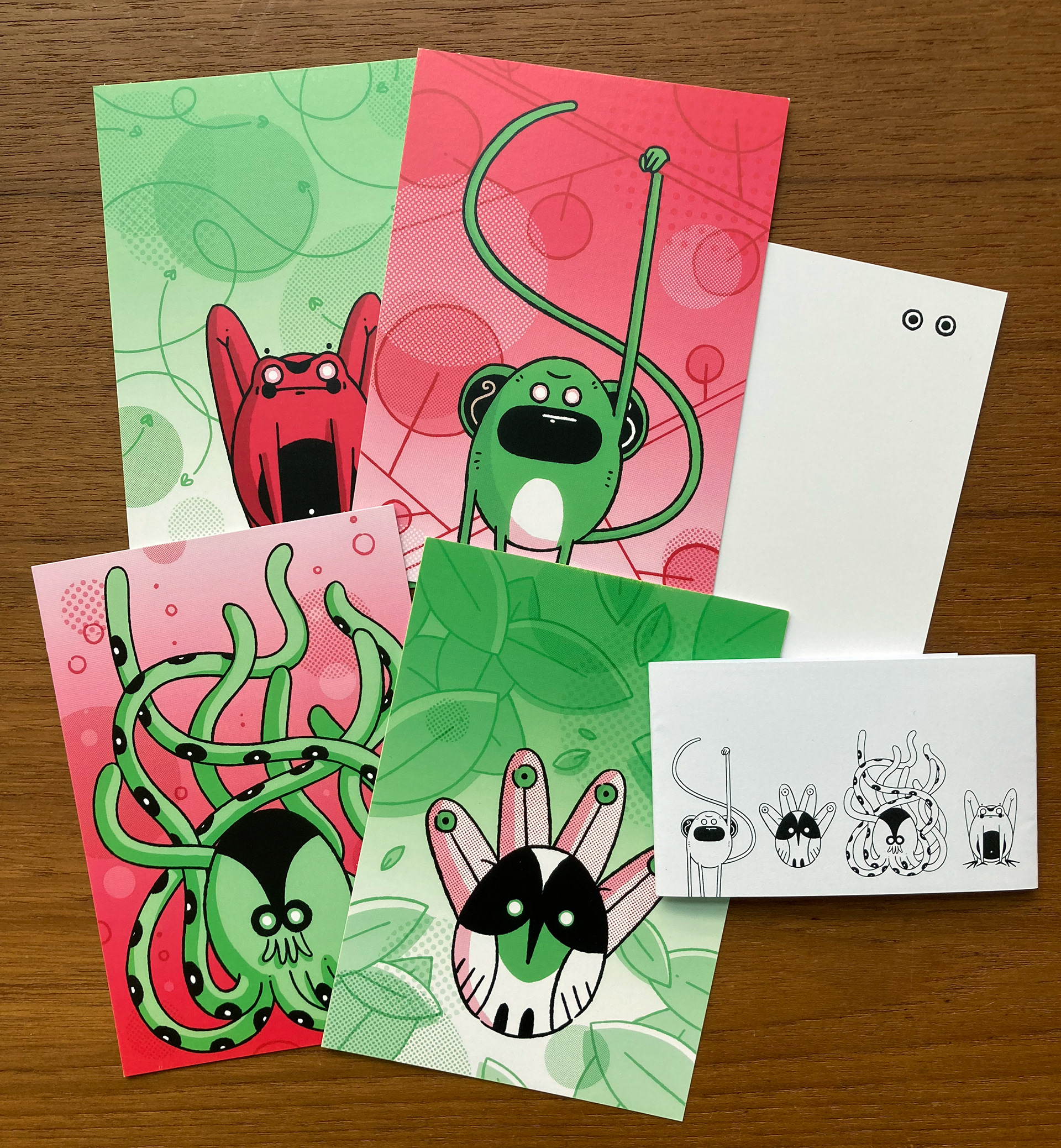 In diesem Postkartenset sind ganze vier illustrierte Tier-Darumas enthalten, die als Wunscherfüller zum neuen Jahr an Freunde und Kunden verschickt wurden.